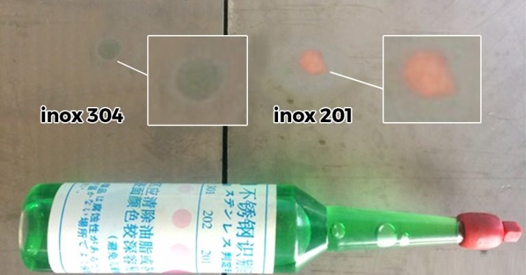 Ngoài cách nhận biết thông qua bề mặt sản phẩm (inox 304 bóng sáng hơn), test thành phần hóa học. Nếu dùng thuốc thử chuyên dùng cho inox, phản ứng màu nâu đỏ sẽ xuất hiện trên inox 201 trong khi phản ứng màu xanh hoặc không màu trên inox 304.